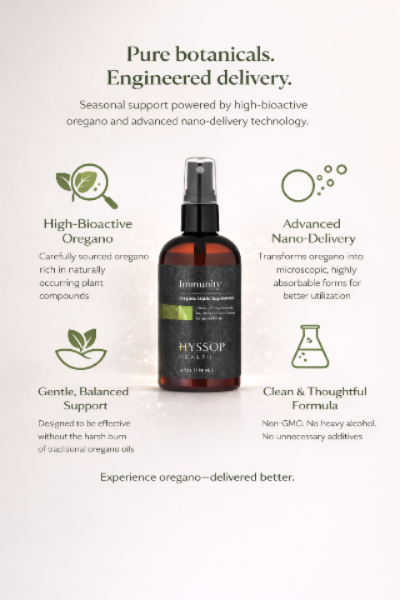 Hyssop Health pairs time-tested plant tradition with advanced nano-delivery technology. By transforming high-bioactive oregano into microscopic, highly absorbable forms, Hyssop is designed to integrate more efficiently and comfortably into modern routines. The result is thoughtful seasonal support that’s effective, balanced, and made for real-world use.